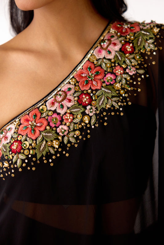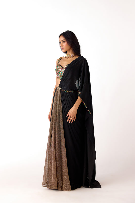 Black Viscose Organza Embroidered Cape Set