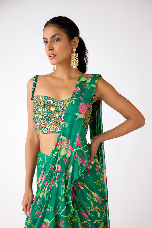 Green Chiffon Embroidered Draped Saree