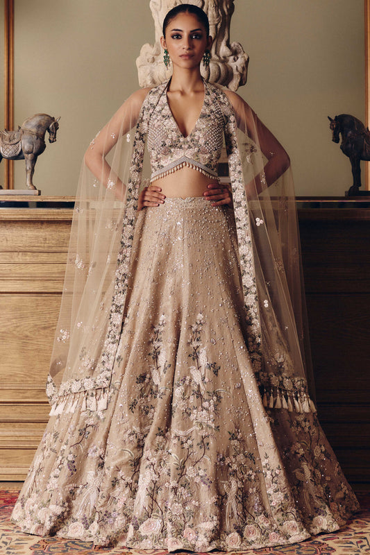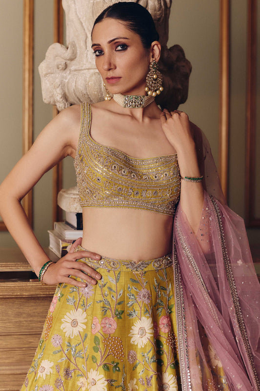The Royal Masai Landscape Aged Pistachio Tissue lehenga