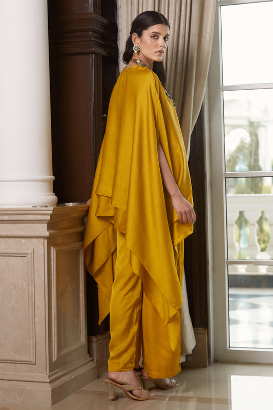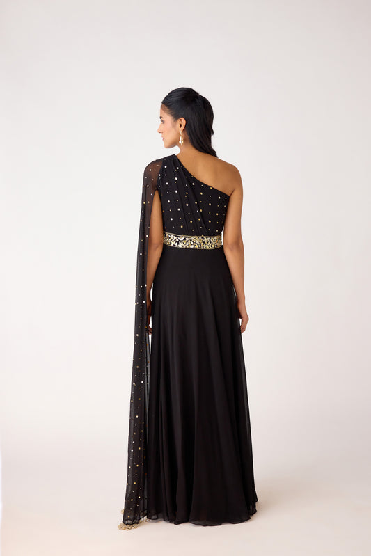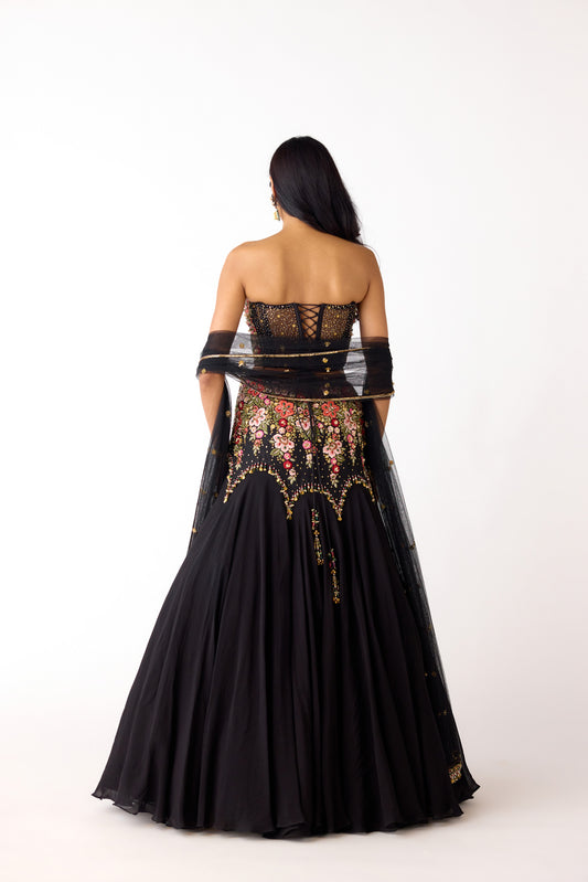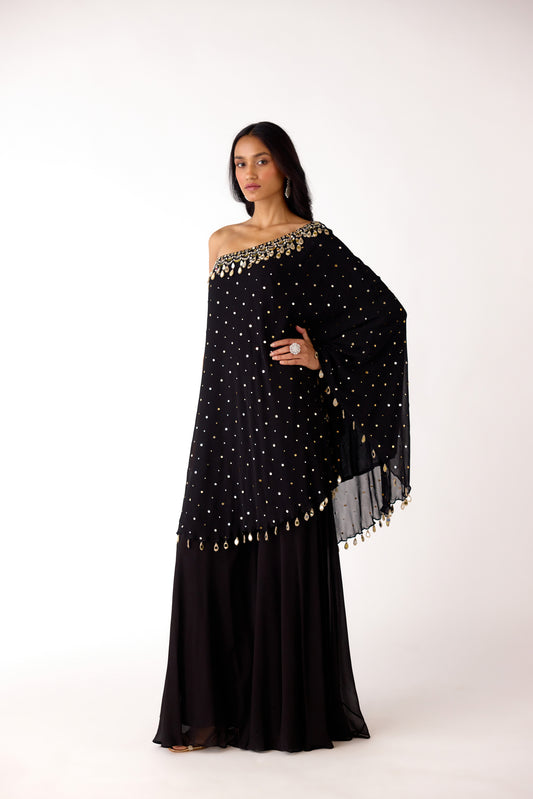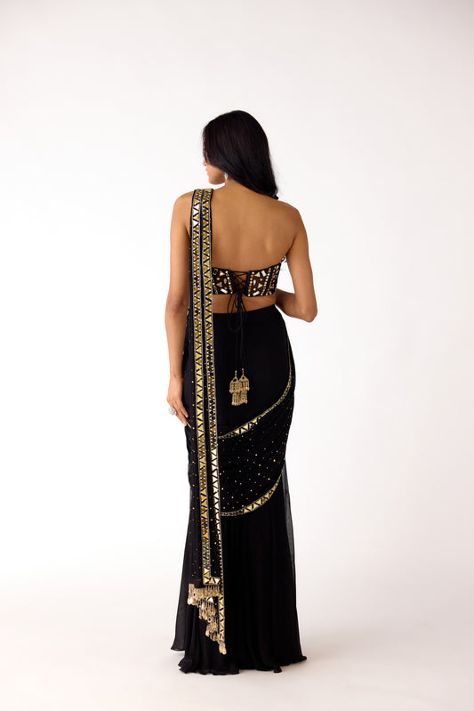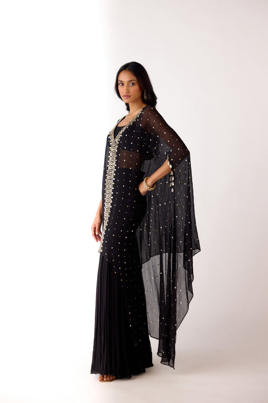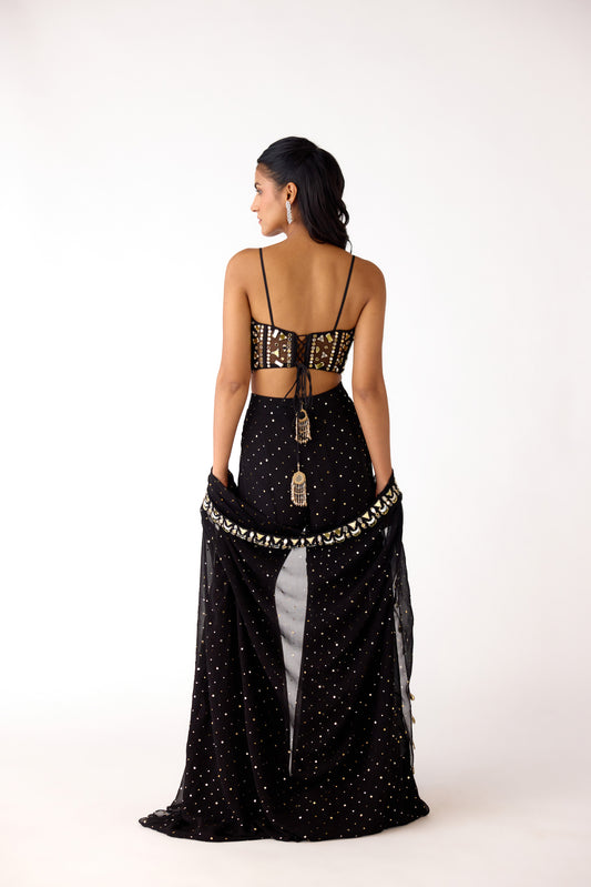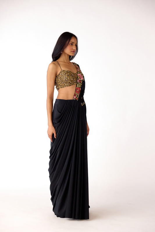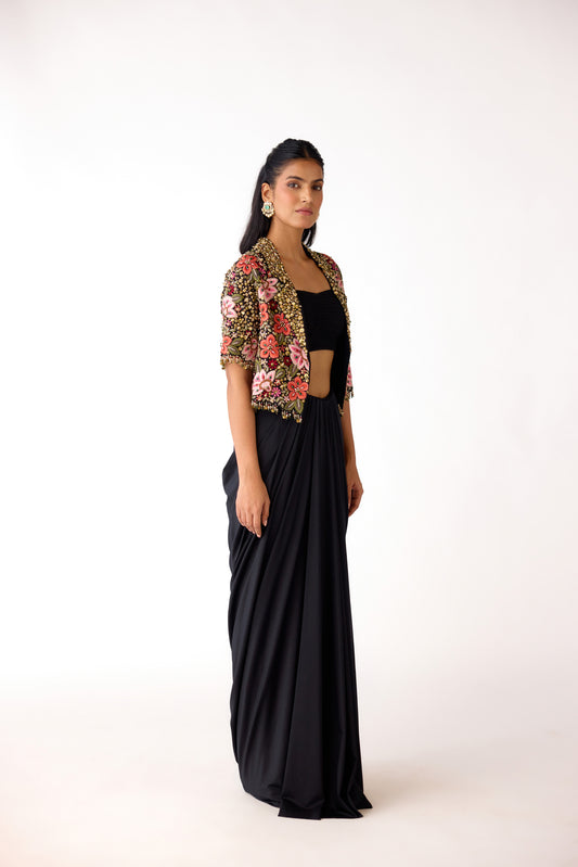 Black Viscose Lycra Embroidered Draped Skirt Set